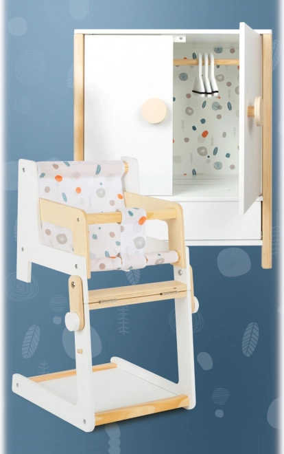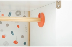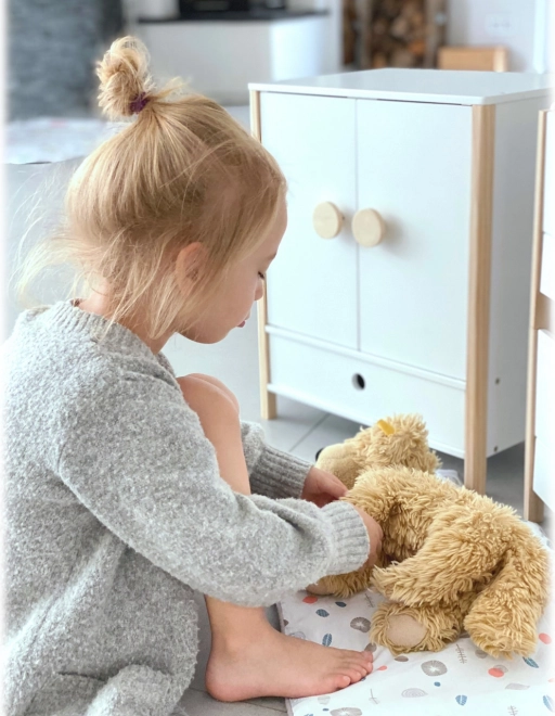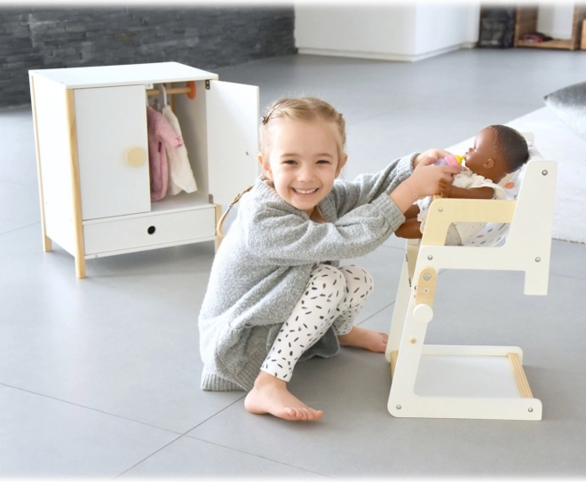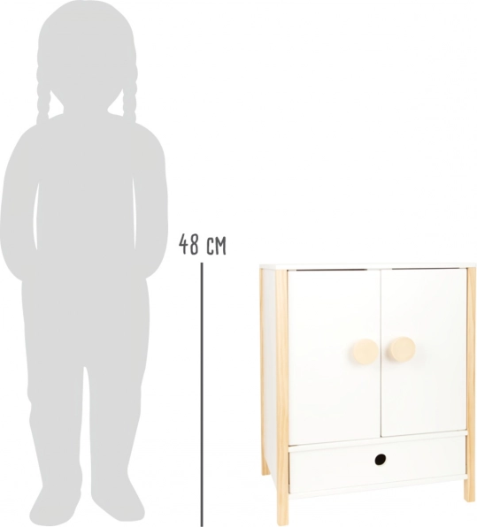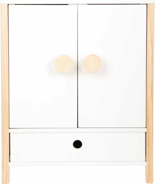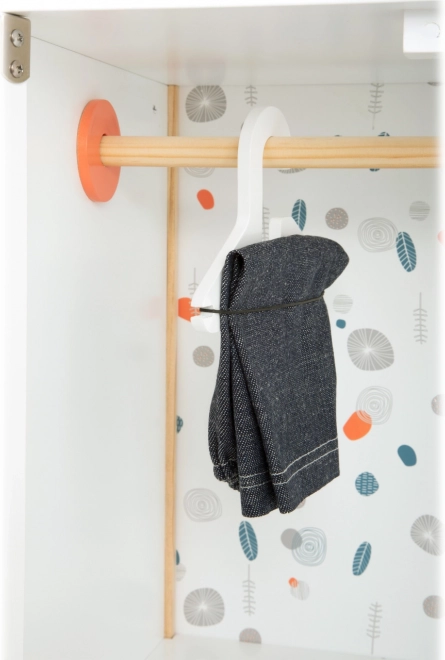 Izdržljiva drvena konstrukcija, stabilna izrada i sigurni, zaobljeni rubovi osiguravaju ugodnu i sigurnu igru. Ormarić potiče samostalnost, osjećaj za red i razvija maštu u igri brige o lutkama.