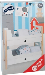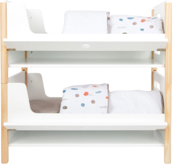 Dio pakiranja je posteljina u neutralnim bojama i oversized popluni koji udobno smještaju lutke ili plišance do 46 cm. Ladice ispod svakog kreveta nude pametno spremište za odjeću i sitne dodatke. Idealan dodatak dječjoj sobi i stilskom kutku za lutke u okviru kolekcije Little Button.