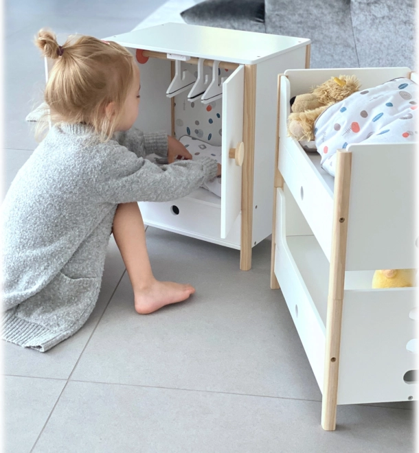 Ladice ispod kreveta održavaju red u dodacima, dok rodno neutralna posteljina i oversized popluni pristaju lutkama do 46 cm.