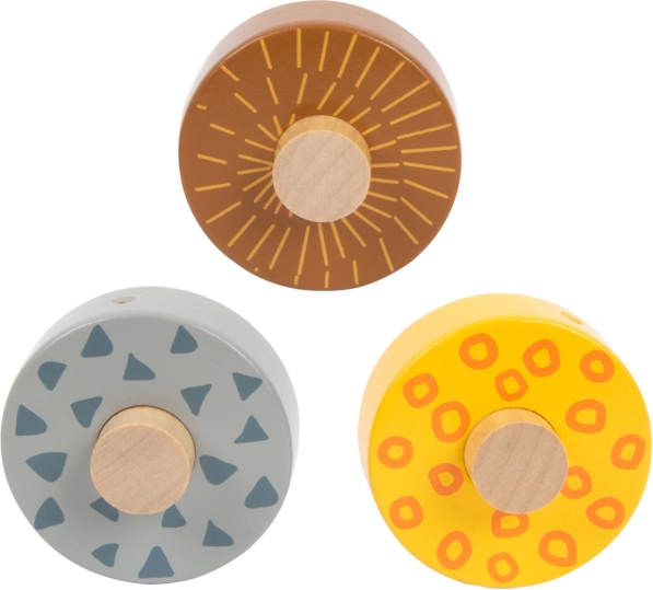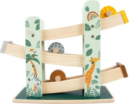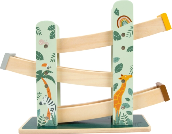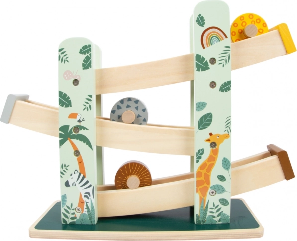 Ova prekrasna drvena staza omogućuje djeci da prate kako tri kolutića, svaki s jedinstvenim dizajnom, spuštaju niz tri rampe. Ukrašena je ilustracijama životinja koje žive na safariju i biljaka iz džungle.