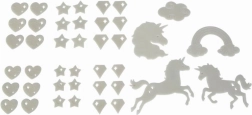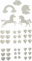 Stvorite čarobnu atmosferu u tren oka. Set fluorescentnih dekoracija s motivom jednoroga nakon izlaganja svjetlu nježno svijetli u mraku i svaku dječju sobu pretvara u bajkovito kraljevstvo. Elemente jednostavno pričvrstite pomoću ljepljive gume koja je dio pakiranja.