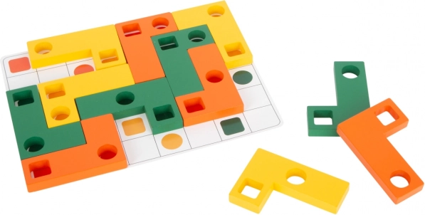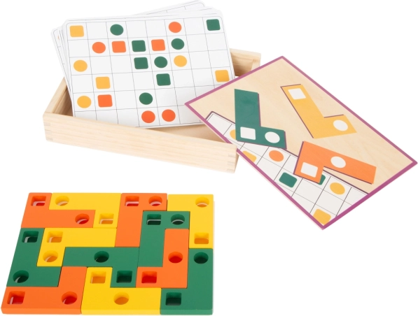 Ova drvena logička igra SMALL FOOT nudi djeci zabavne izazove i pametno učenje. Dijelovi s različitim otvorima umeću se na igraće kartice prema predlošcima, pa djeca uvježbavaju preciznost, strpljenje i strategiju slaganja. Zahvaljujući živim bojama i oblicima, igra je privlačna i lako razumljiva.
