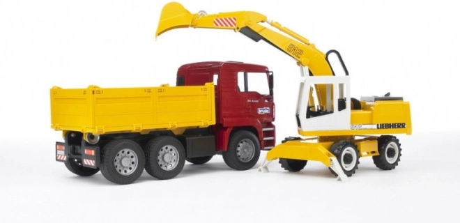 Ovaj sjajni građevinski set tvrtke Bruder uključuje MAN TGA kamion s mekim gumama i praktičnom kiper karoserijom. Uz njega dolazi i funkcionalni bager Liebherr koji se ističe stabilizacijskim potpornim nogama, profiliranim gumama i žlicom s kabinom koja se okreće za 360°. Proizvod je kvalitetno izrađen u Njemačkoj od izdržljivih materijala.
