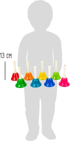 Ovaj osmeročlani set zvončića idealan je za male glazbenike, svaki zvončić usklađen je na drugu notu i razlikuje se živim bojama, koje razvijaju dječji glazbeni sluh i koordinaciju.
