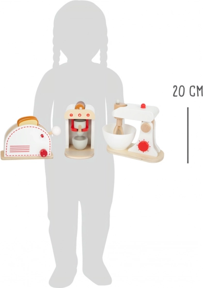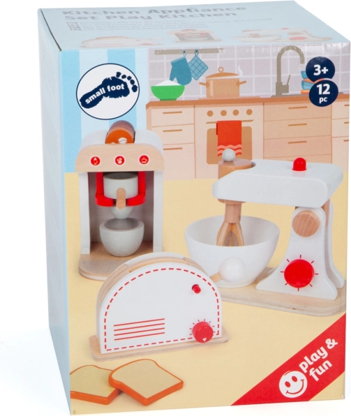 Ovaj stilski drveni set donosi u dječju kuhinjicu tri najomiljenija aparata: toster, aparat za kavu i mikser. Realistične funkcije poput klikajućih kontrola, poluge za izbacivanje na tosteru i rotirajuće metlice na mikseru potiču maštu, samostalnu igru i razvoj fine motorike.
