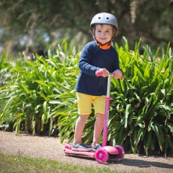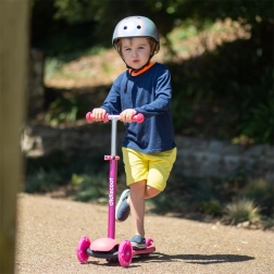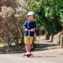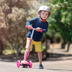 Upravljač je podesiv na tri visine – 58 cm, 67 cm i 76 cm – što omogućuje da romobil raste zajedno s vašim djetetom. Opremljen je stražnjom kočnicom za veću sigurnost tijekom vožnje. Konstrukcija kombinira čvrste i neškodljive plastike s laganim legurama kako bi romobil bio lagan i jednostavan za upravljanje.