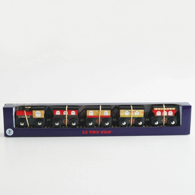 Stilski drveni vlak ROYAL EXPRESS od Le Toy Van oduševit će djecu i roditelje. Sadrži lokomotivu i pet vagona s magnetnim povezivanjem, izrađen je od održivog drva i obojan netoksičnim bojama na bazi vode. Potiče finu motoriku, maštovitu igru i kompatibilan je s većinom drvenih željezničkih setova.