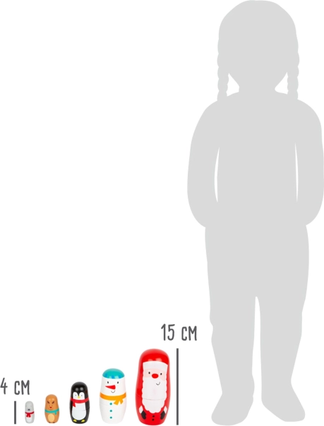Otkrijte čaroliju Božića s drvenim matroškama Small Foot. Pet precizno oslikanih figurica u tradicionalnom ruskom stilu postupno se umeće jedna u drugu – od najveće do najmanje. Set je savršen kao blagdanska dekoracija i kao draga igračka koja prirodno potiče dječje vještine.