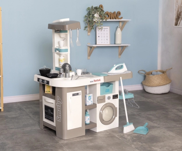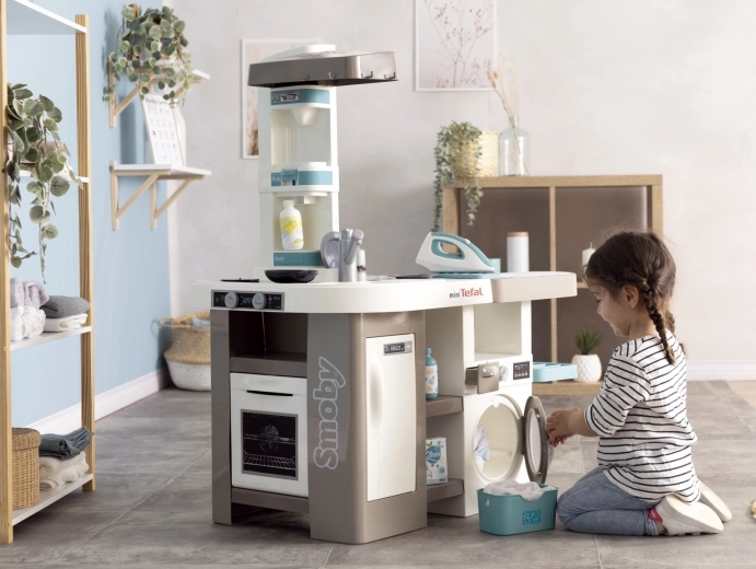 Multifunkcionalna dječja kuhinjica SMOBY TEFAL Studio 2 u 1 spaja kuhanje, pranje i glačanje u jednom setu za igru. Nudi elektroničku ploču za kuhanje sa zvukovima, pećnicu, hladnjak, sudoper i aparatom za kavu, kao i praonicu s perilicom rublja, sušilom i daskom za glačanje s mehaničkim glačalom. U kompletu je 36 dodataka za realističnu igru i razvoj dječje mašte.