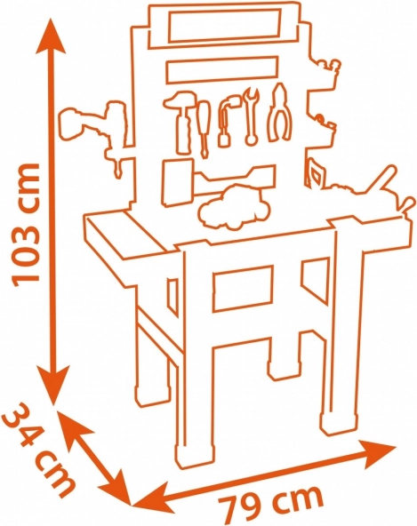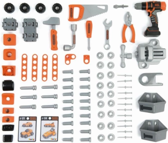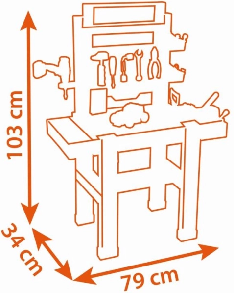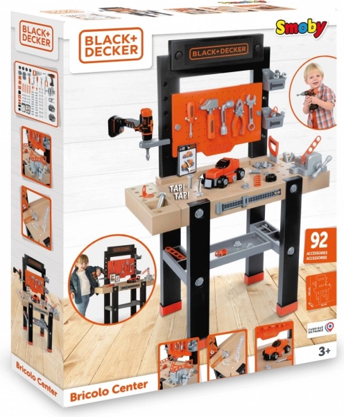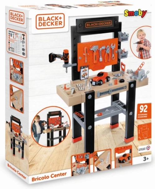 Velika dječja radna klupa BLACK+DECKER Bricolo Center tvrtke Smoby donosi realističnu radionicu s 92 dodacima. U njoj ćete pronaći mehaničku bušilicu, stegu, odvijače, čekić, pilu, kliješta te autić za sastavljanje. Stabilna konstrukcija, praktični spremnici i dimenzije 103 × 79 × 34 cm potiču razvoj fine motorike i kreativnosti djece od 3 godine.
