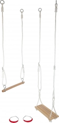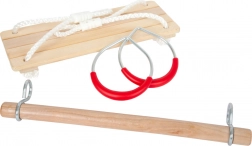 Ovaj multifunkcionalni set za male akrobate donosi aktivno kretanje i radost u vrt i dječju sobu. Klasična drvena ljuljačka, viseća prečka i gimnastički kolutovi s udobnim plastičnim rukohvatima potiču razvoj koordinacije, snage i ravnoteže.