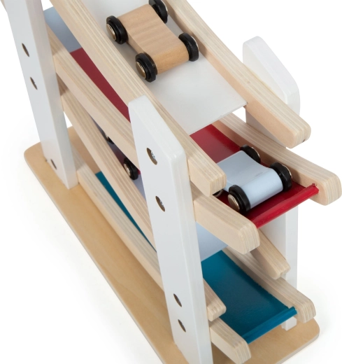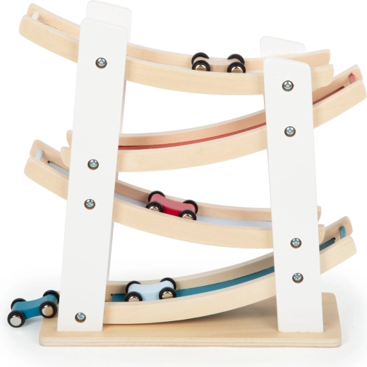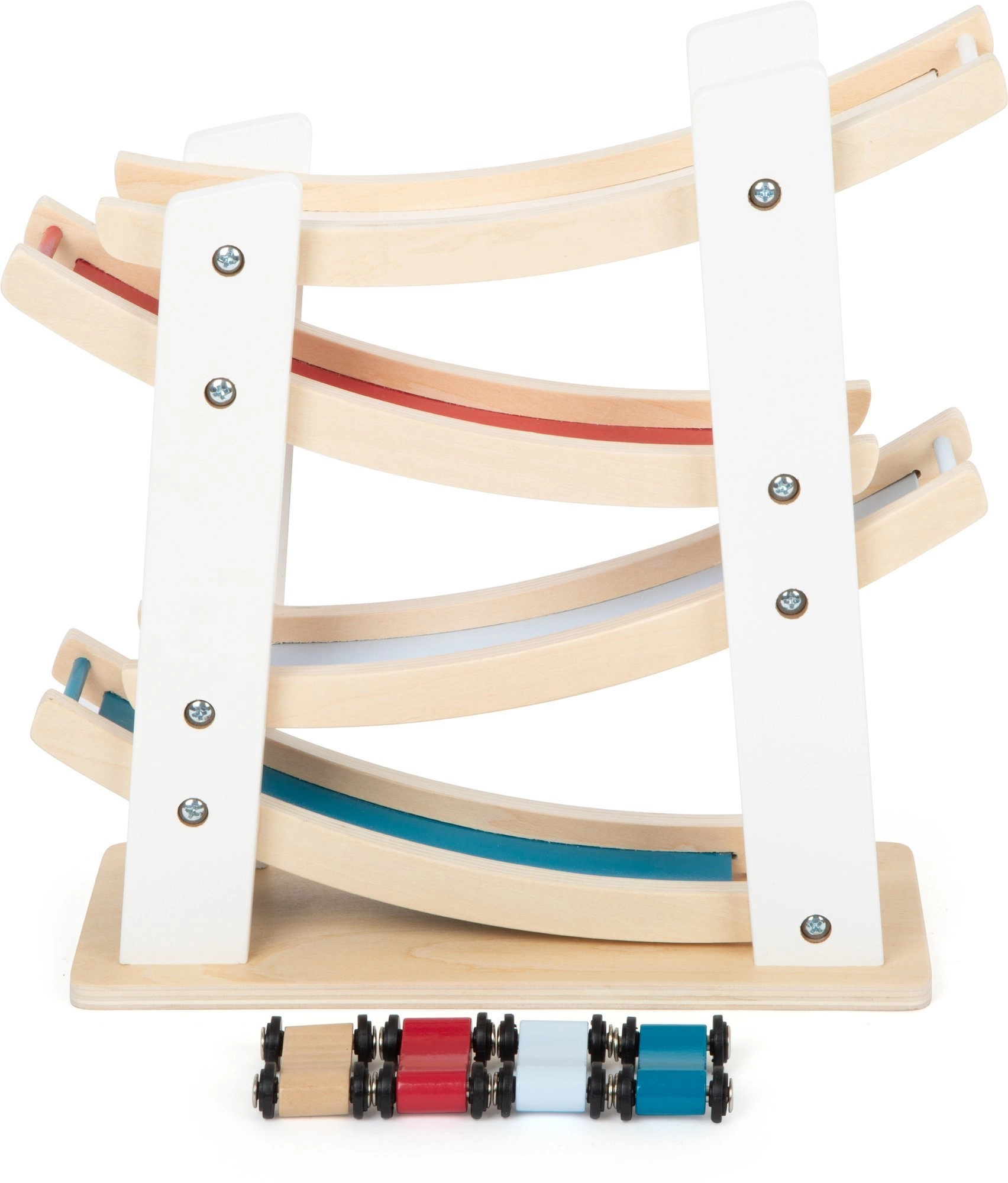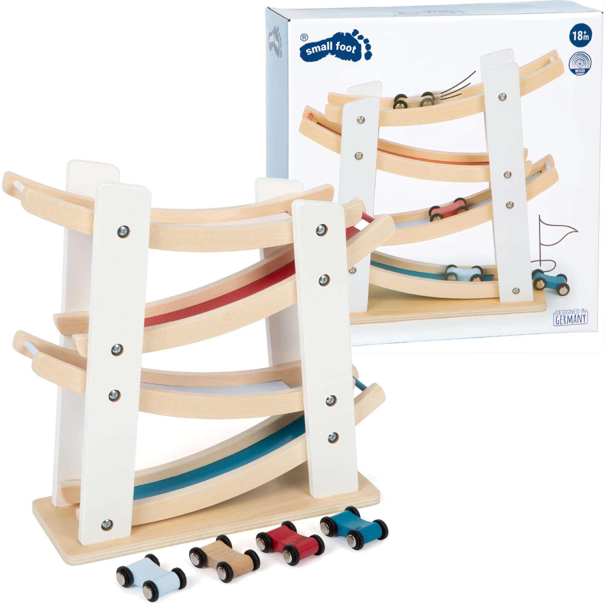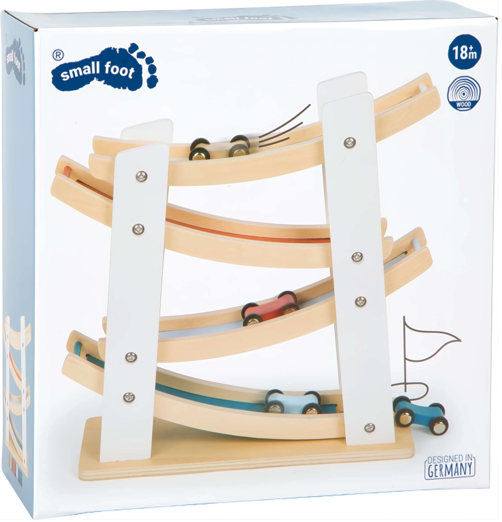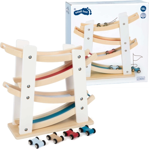 Otkrijte zabavu za najmlađe s drvenom trkaćom stazom s autićima od Small Foot. Robusna konstrukcija od prirodnog drva, četiri šarena autića i glatko spuštanje niz kaskadne rampe razvijaju finu motoriku, koordinaciju oko–ruka i razumijevanje uzroka i posljedice. Idealna igračka od 18 mjeseci za svakodnevnu kreativnu igru.