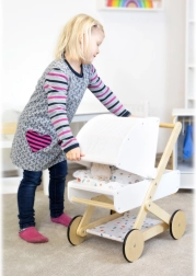 Otkrijte kvalitetna kolica za lutke koja se savršeno uklapaju u svaku dječju sobu. Kombiniraju prirodno drvo, izdržljive i perive tkanine te nježnu paletu boja. Mala težina i stabilna konstrukcija jamče sigurnu vožnju, dok se gumirani kotači brinu za tihi rad na svakoj podlozi.
