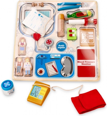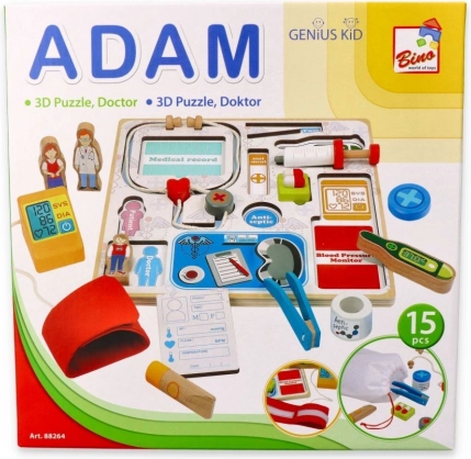 Ova šarena umetajuća slagalica brenda Bino djeci približava svijet zdravstva kroz igru. Zahvaljujući jasno oblikovanim dijelovima, djeca lako prepoznaju i pridružuju stetoskop, toplomjer, injekciju i druga pomagala na pravo mjesto na ploči. Tijekom igre vježbaju hvat, koncentraciju i strpljenje.