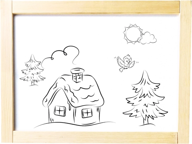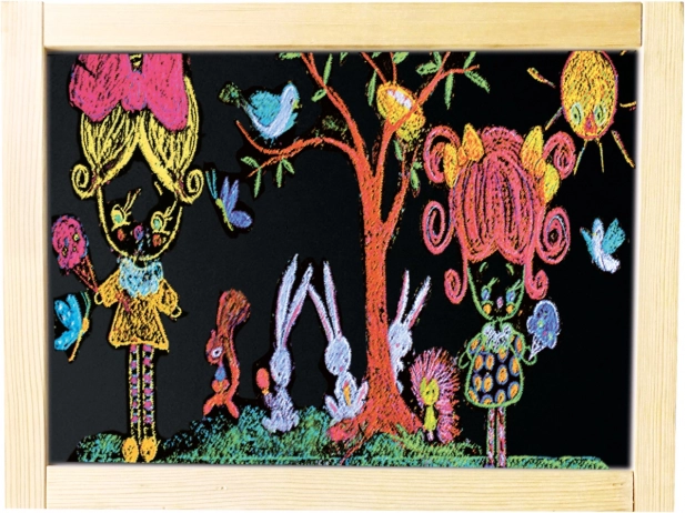 U pakiranju je sve potrebno: kreda, flomaster, spužvica i nekoliko magnetskih sličica. Ploča se može brzo sklopiti i kompaktno spremiti, pa ne zauzima mnogo mjesta. Dvije radne površine omogućuju da dvoje djece stvara istovremeno.