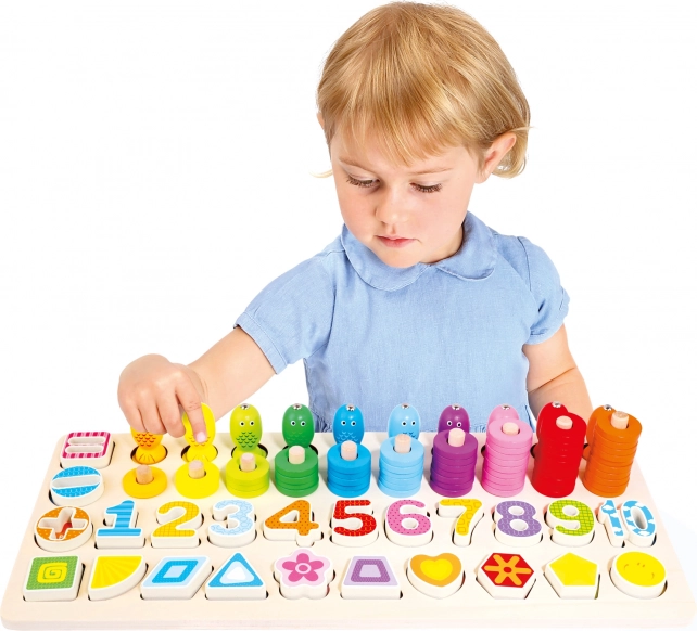 Pomoću šarenih oblika i brojeva, igračka potiče učenje osnova brojanja i prepoznavanja oblika.