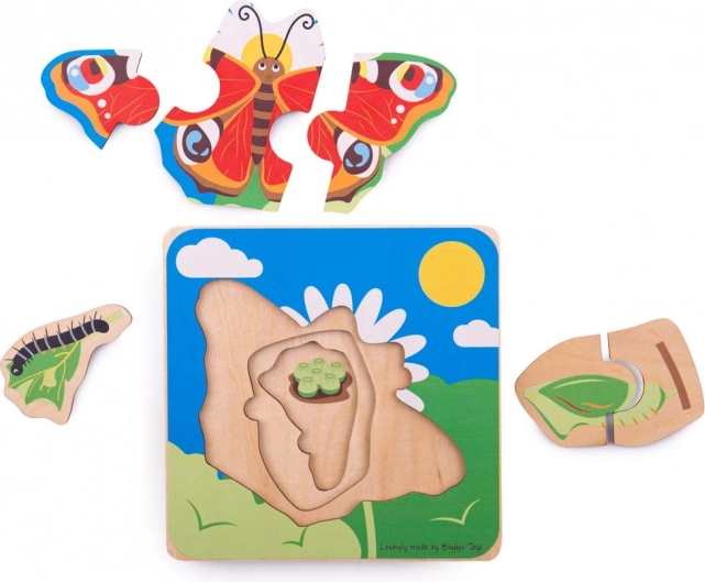 Ova slojevita drvena slagalica idealno je nastavno pomagalo za male istraživače. Djeca korak po korak otkrivaju kako se iz jajeta razvija gusjenica, kukuljica, a na kraju prekrasan leptir. Zahvaljujući četirima slojevima i čvrstim dijelovima, slaganje je intuitivno i zabavno.