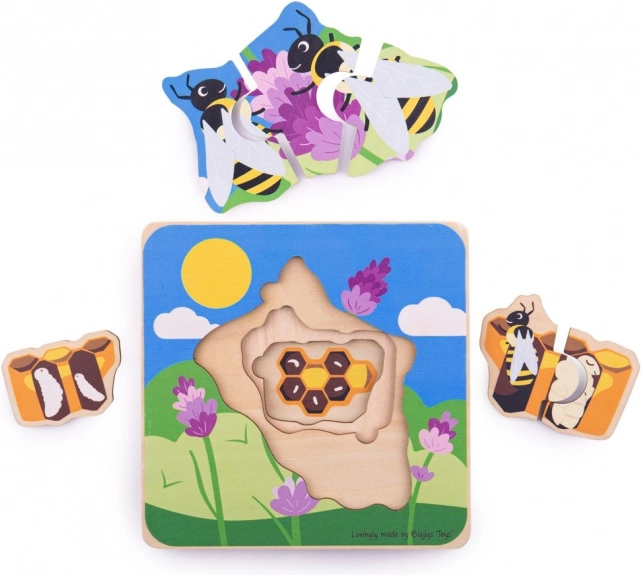 Slojevita konstrukcija s postupno mijenjajućim slikama prikazuje pojedine faze razvoja – od jajeta do odrasle pčele. Dijelovi su veličinom prilagođeni dječjim rukama, a zahvaljujući čvrstoj izradi podnose i često korištenje.