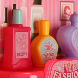 U kompletu su češljići, ogledalce, bočice, dodaci za kosu i druge rekvizite za realistično igranje frizerskog i kozmetičkog salona.