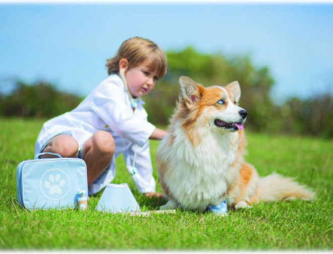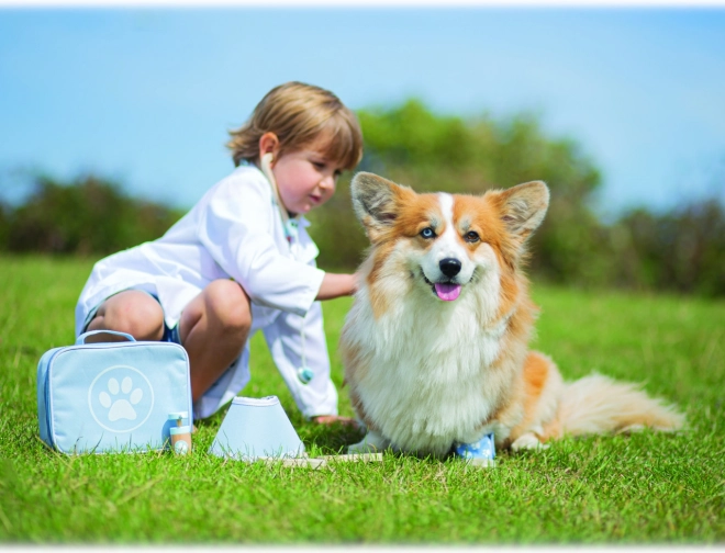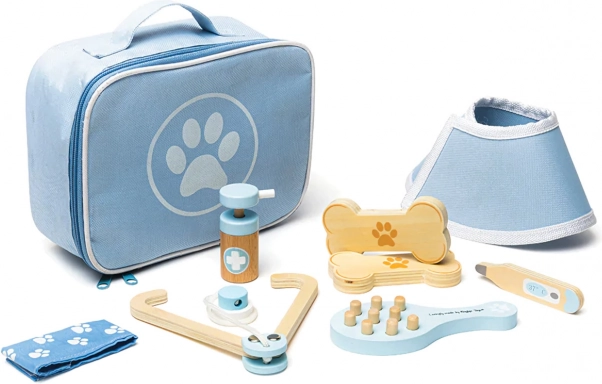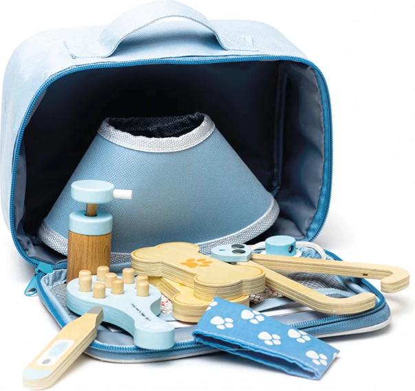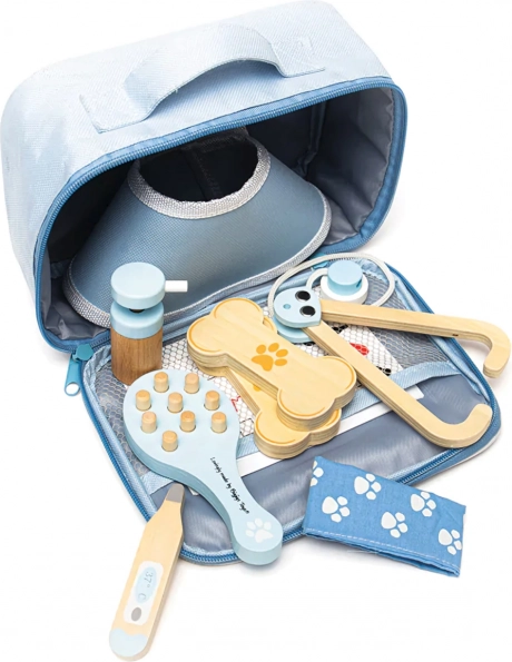 Kompletni veterinarski koferić omogućuje djeci brigu o plišancima i figuricama ljubimaca kao pravom doktoru. U setu se nalaze alati kao stetoskop, toplomjer, otoskop, injekcijska šprica, zavoj, četka, zaštitni ovratnik i drugi dodaci. Sve je pohranjeno u izdržljivoj tekstilnoj torbici s otiskom šape, idealnoj za nošenje i spremanje.