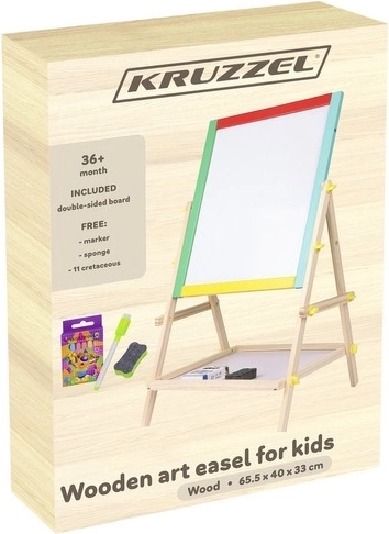 Ova dvostrana ploča KRUZZEL nudi dvije površine za crtanje i pisanje: krednu i suhobrisivu. Jednostavno okretanje i leptir vijci omogućuju brzu promjenu strane. Drveni okvir sa šarenim elementima čvrst je, gladak i siguran za djecu.
