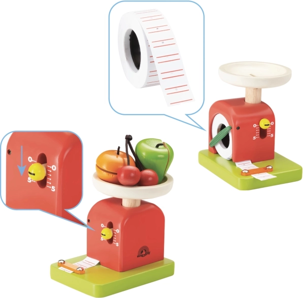 Stilna dječja vaga od masivnog drva pomaže djeci razumjeti važnost mase i uvježbati računanje. Ima pokretno mjerilo, zamjenjivu papirnatu traku za bilješke i izdržljivu drvenu izradu u živim bojama – idealno za igre uloga trgovine i razvoj fine motorike.