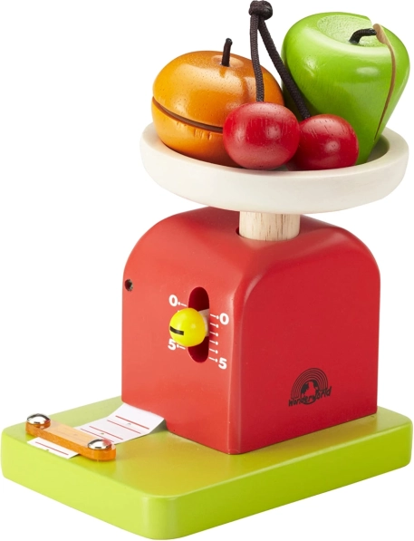 Čvrsta konstrukcija od masivnog drva i kvalitetan lak u živim bojama osiguravaju dug vijek trajanja i sigurnu uporabu. Igračka potiče razvoj fine motorike, logičkog razmišljanja i mašte tijekom igre trgovine, kuhinje ili tržnice.