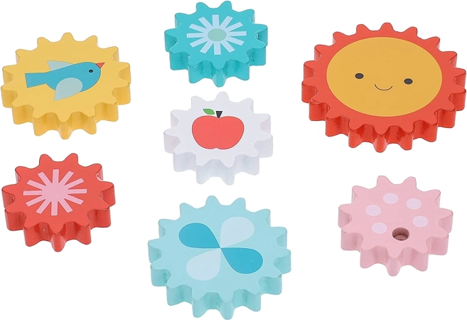 Proizvod sadrži čvrstu drvenu osnovu i sedam šarenih zupčanika, koji su dizajnirani tako da djeca stječu nove vještine pri okretanju i smještanju zupčanika. Raznoliki uzorci, kao što su sunce, jabuka i ptičica, čine ovu igračku vizualno privlačnom i atraktivnom.