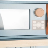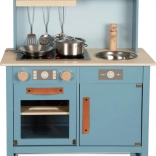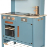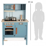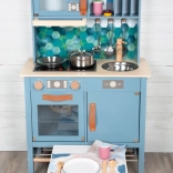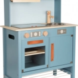 Dječja kuhinjica u dim sivo-plavoj nijansi sa stilskim kožnim ručkama nudi realističan dojam kuhanja.