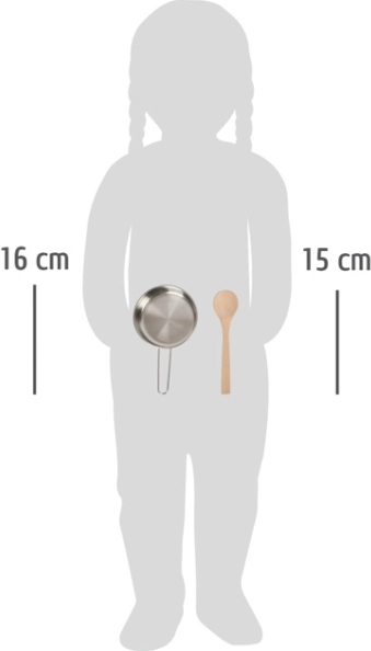 Lonac s odvojivim poklopcem pridonosi realističnim scenarijima igre i potiče dječju maštu. Drvena kuhača zajedno s metalnim alatima poput lopatice i pjenjače nudi širok izbor mogućnosti za igru. Tekstilna rukavica za pećnicu i podložak za lonac daju autentičan dojam i doprinose sigurnosti tijekom igre.