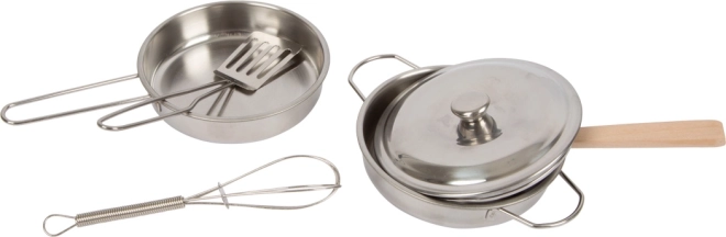 Sadrži lonac s poklopcem, tavu, pjenjaču, lopaticu i drvenu kuhaču koji pomažu pri igri kuhara.