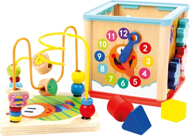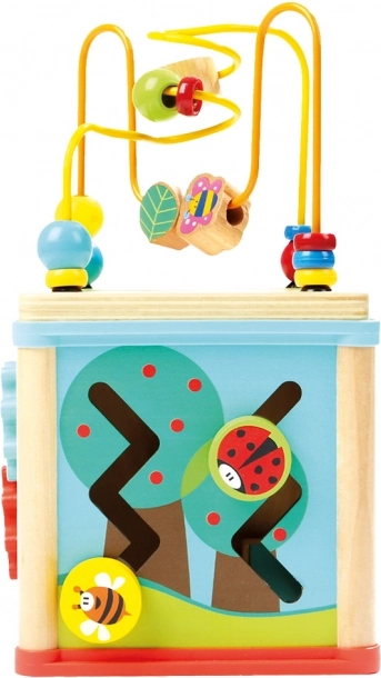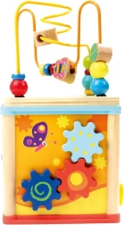 Ova šarena drvena motorička kocka nudi djeci od 12 mjeseci mnogo načina za igru i učenje. Zahvaljujući satu s kazaljkama djeca se kroz igru upoznaju s vremenom, labirint s perlicama razvija hvat i koordinaciju, a ostale strane kocke vježbaju logiku, oblike i boje.