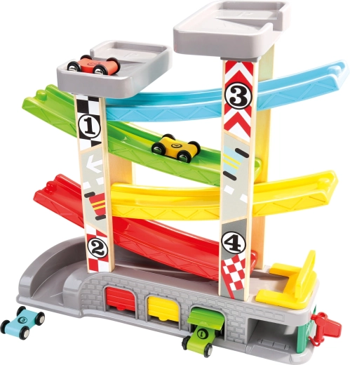 Ova šarena kaskadna autostaza donosi dinamičnu vožnju u kojoj jedan natjecatelj može tijesno pratiti drugoga. Djeca će uživati u glatkom spustu niz višerazinske rampe, točenju goriva u boxevima i parkiranju u garažama s preklopnim vratima. Zahvaljujući promišljenoj izradi, autostaza potiče finu motoriku, koordinaciju oko–ruka i razvoj mašte.