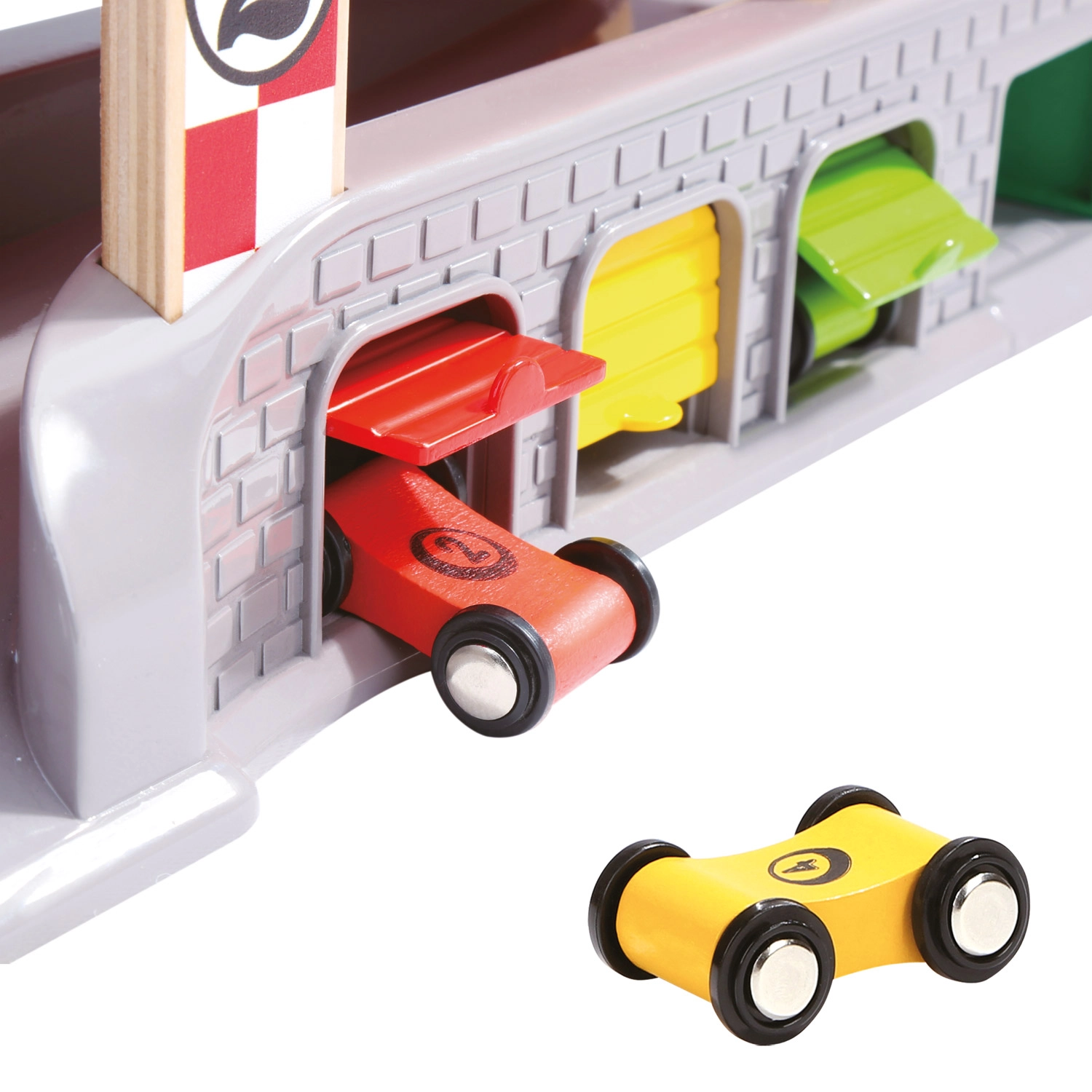 Pokrenite utrke punom brzinom s autostazom koja nudi dva startna podesta, pit boxeve za točenje goriva i tri garaže s otvarajućim vratima. Robusna kombinacija drva, plastike i metala jamči izdržljivost, dok žive boje privlače pažnju i potiču dječju maštu. U kompletu su 4 šarena autića za neiscrpnu dozu trkaće zabave.