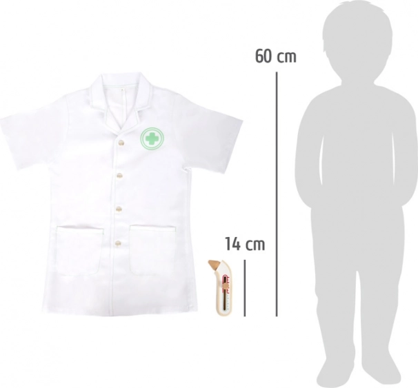 Dječji doktorski set small foot donosi sve što malim liječnicima treba za njihovu prvu ordinaciju. Ogrtač u veličini 110 prikladan je za djecu visoku 105–110 cm i zahvaljujući kopčanju na drukere lako se oblači i svlači. Drveni rekviziti ugodni su u ruci, izdržljivi i sigurni za dječju igru.