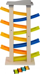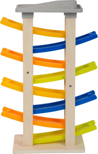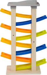 Upoznajte ovu jedinstvenu utrkačku stazu s osam rampi koja će oduševiti svakog malog vozača. Na vrhu staze nalazi se udobno parkiralište za četiri drvena autića. Ova igračka podržava akustičko opažanje zahvaljujući klapajućim zvucima koje autići proizvode pri spuštanju. Zbog svoje široke baze staza je izrazito stabilna i sigurna.