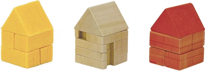 Robusni drveni dijelovi i šareni oblici potiču na gradnju kućica i slaganje vuka. Djeca prirodno razvijaju finu motoriku i maštu.