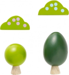 Opsežan set s razvijenom mrežom tračnica, dvama vlakovima s magnetskim vagonima, stablima i prometnim elementima potiče maštu i razvoj fine motorike.