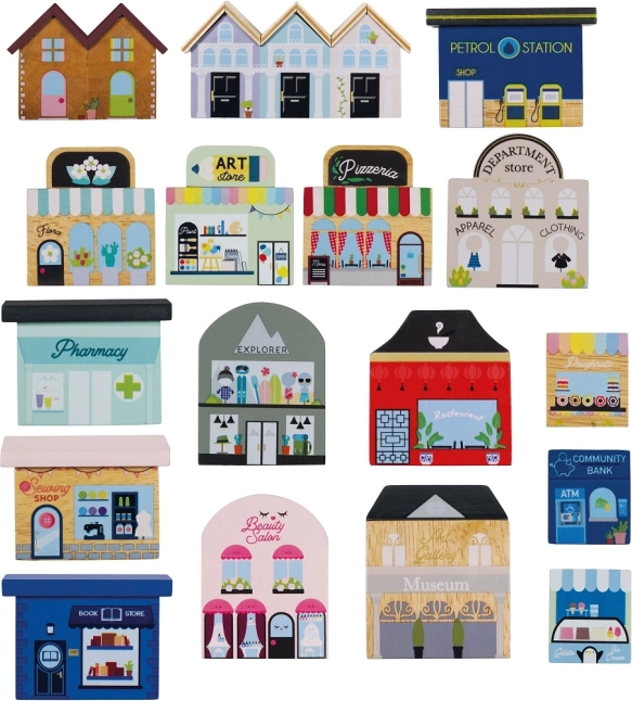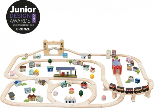 Ova velika drvena željeznička pruga vodi djecu u srce grada nadahnutog Londonom. Zahvaljujući bogatoj opremi – od kolodvora preko šarenih zgrada do kultnog podiznog mosta – nudi bezbroj igraćih scenarija i potiče otvorenu, maštovitu igru. Dva vlaka s magnetskim vagonima lako se spajaju i sigurno voze po stabilnim drvenim tračnicama.