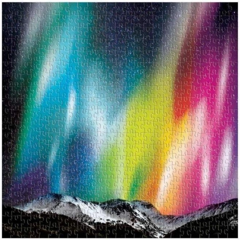 Vibrantne boje i detaljna scena sjevernih svjetala iznad planina pretvaraju slaganje u vizualno upečatljivo iskustvo.