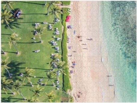 Dvostrano izvedenje donosi dvostruko zadovoljstvo slaganja. Jedna strana prikazuje živahnu plažu s posjetiteljima koji se sunčaju, druga otkriva tirkizni ocean i podmorski svijet.