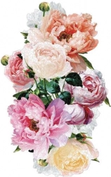 Bogata kompozicija cvjetova božura u pastelnim tonovima daje dovršenoj slici profinjenu eleganciju i dekorativan izgled.