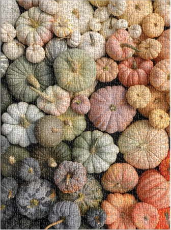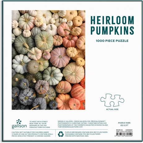 Dizajnerski motiv “Heirloom Pumpkins” autorice Christine Chitnis donosi raznoliku paletu ljubičastih, zelenih, žutih i narančastih bundeva. Puzzle su pakirane u mat, čvrstu kutiju, koja odlično služi i kao poklon pakiranje ili stilska spremnica. U pakiranju se nalazi i puna kolor predložak dovršene slike.