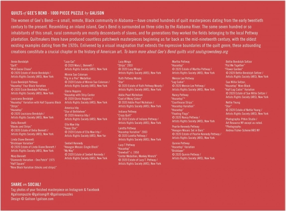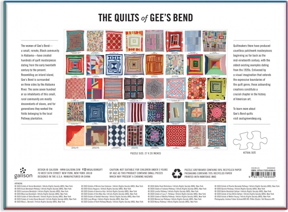 Uronite u vizualno dojmljivu kolekciju patchwork uzoraka nadahnutih radom žena iz Gee’s Benda u Alabami. Ova slagalica od 1000 dijelova nudi kombinaciju bogatih boja i geometrijskih motiva koji stvaraju jedinstvenu sliku visoke dekorativne vrijednosti.