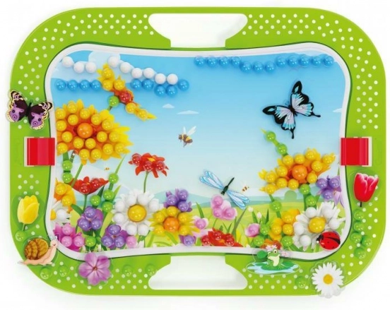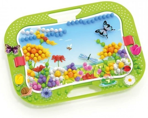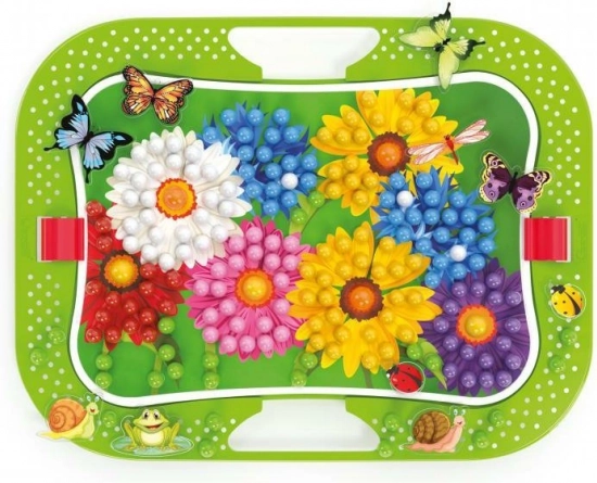 Stvorite svoju cvjetnu vrtu od kvačica! Klasične Quercetti kvačice u šarenoj verziji koja predstavlja svijet prirode. Set sadrži kvačice različitih boja i promjera, čijim se umetanje stvara raznoliki krajolici, te mnogo naljepnica i figurica leptira, žaba, bubamara i drugih stvorenja kojima možete naseliti svoj prirodni svijet. Sadržaj pakiranja: 1 perforirana podloga 28 × 20 cm, 2 predloška, 300 kvačica u 6 različitih boja, 16 figurica, 1 podnožje s postoljem, 1 drvena probadajuća olovka. Glavne značajke: razvija finu motoriku, kreativnost i maštu, sadrži 316 gumba, za djecu od 3 godine naviše.