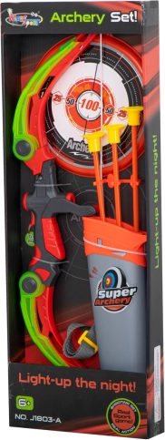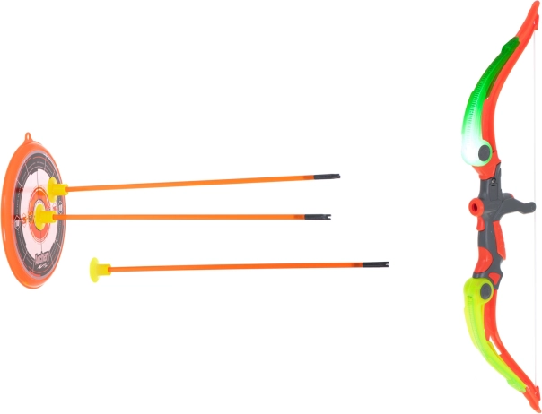 Zabavan i siguran set za male streličare: dječji luk s vakuumskim/prisavnim strijelama, metom i kožnim tobolcem/kviverom. Zahvaljujući gumenom nategu i mekim prisavkama igra je sigurna u kući i na otvorenom, razvija koordinaciju, preciznost i kreativnost. Luk ima svjetlosne efekte na baterije za još veću zabavu.