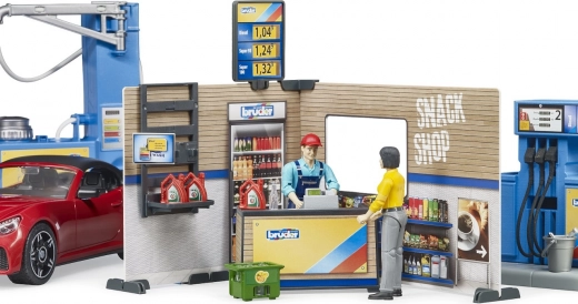 Dio seta je i varijabilni sportski automobil s odvojivim kolima i krovom, koji je u potpunosti kompatibilan s figuricama i dodacima BRUDER BWORLD. Obostrano tiskane kulise, police s kanistrima i cjenik potiču kreativnu i edukativnu igru.