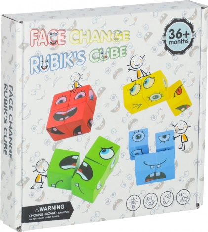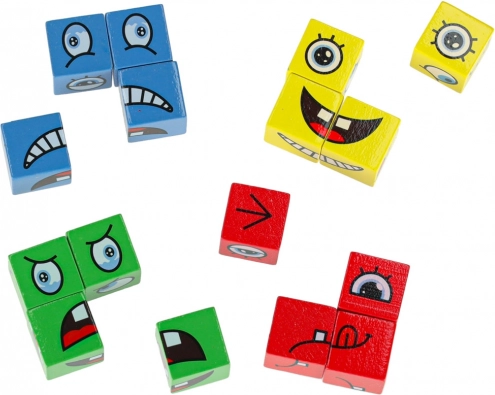 Glatko brušene kocke s tiskom očiju i usta omogućuju slaganje desetaka izraza. Čvrste, sigurne i ugodne za držanje.