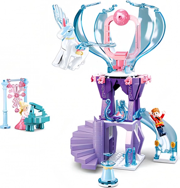 Građevna igračka sadrži prekrasnu ljubičasto-plavu kulu s funkcionalnim elementima poput tobogana i stubišta.
