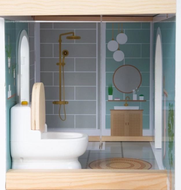 Ova moderna kućica za lutke donosi otvoreni koncept stanovanja, u kojem djeca otkrivaju kuhinju s blagovaonskim kutkom, spavaću sobu, kupaonicu i veliku terasu s mjestom za sjedenje. Zahvaljujući otvorenoj prednjoj strani, igri se lako pristupa sprijeda i u njoj može uživati više djece u isto vrijeme. Svijetla fasada i prigušene boje sjajno se uklapaju u svaki interijer.